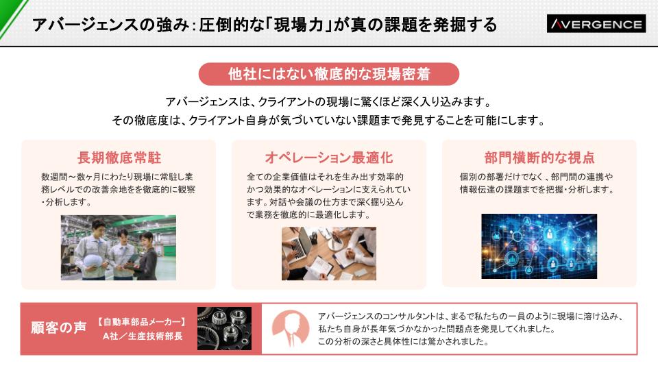 「変革」を掲げながらも、その成果が数字に表れず悩んでいませんか?この資料では、アバージェンスが支援した3社のリアルな変革事例を、具体的な数字と共に紹介します。大手SIerの営業プロセス刷新、通信事業者の大規模ロジスティクス改革、大手電機メーカーのSCM改革といった成功事例を通して、机上の空論ではない、現場に深くコミットする「圧倒的な現場力」が、いかにして確実な成果を生み出すか、その軌跡を解説します。